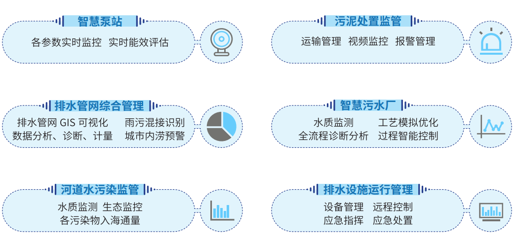 综合监管系统能够实现对管网、泵站、水质净化厂以及河湖水环境、水资源、水生态的综合管理结合物联网、大数据应用等技术,可实时查看监测对象的动态数据及运行情况,及时掌握运行规律.预警信息,智能判断决策方案,做到及时发现、有效控制,全流程、精细化管理目标。