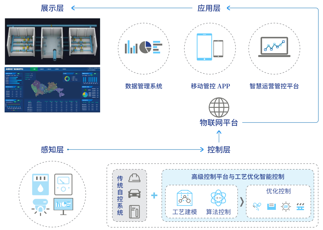 二次供水管理运用“物联网”“云计算”“大数据”等技术,建立智能化的运行管控平台,实现水厂的全流程自动化控制,数字化运维管理、全生命周期的设备资产管理,一体化安防管控及科学决策辅助,为水厂安全可靠运行,生产水质优良稳定提供保障,降低水厂生产的能耗、药耗,并通过集中化运营、少人/无人值守模式转变,实现管理提升和减员增效。