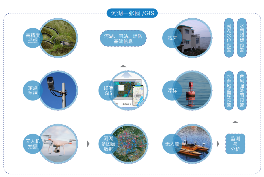 河湖水系是山水林田湖草沙生命共同体的重要组成部分在保障水资源安全、改善水质、调节区域小气候、维护生物多样性、改善生态环境等方面具有不可替代的作用。利用空天地一体化监测技术,构建智慧河湖监管平台,平台利用GIS技术构建河湖一张图、并对水雨风情监视、河湖健康评估、工情监视分析、汛涝风险预警、水质监测分析及污染来源解析等,为河湖精准监管提供重要支撑保障。